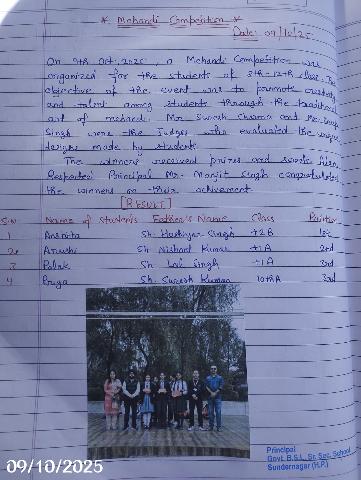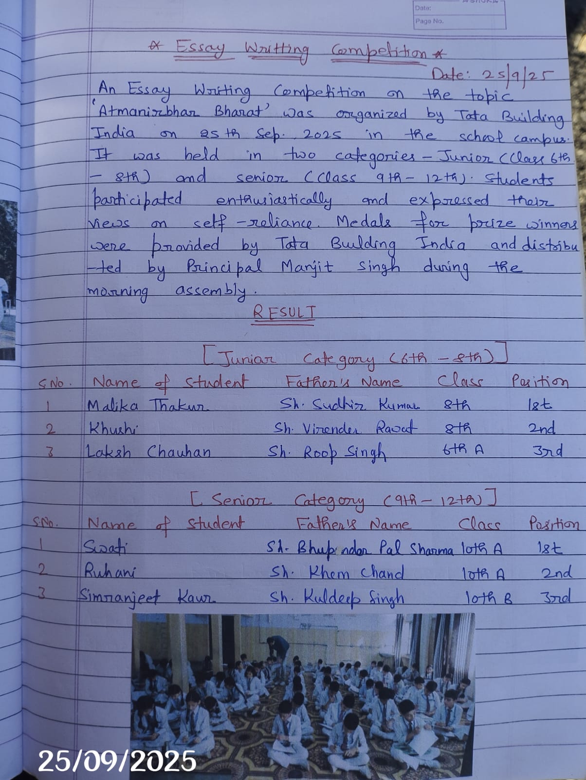 A slogan writing competition was conducted under the Swachhata Hi Seva campaign on September 28, 2024, focusing on eco-friendly practices and reducing plastic waste. 88 students participated, divided into two groups, with judges Mr. Satish Banati and Mr. Bhup Singh.